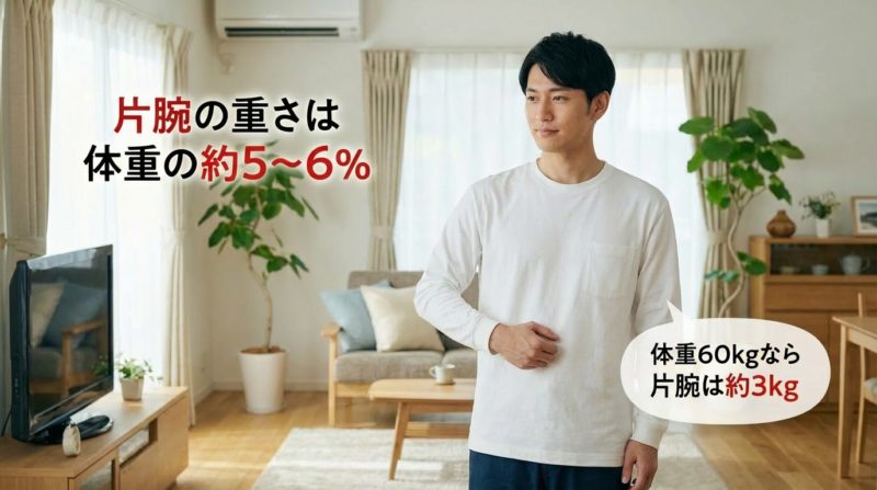 人の腕(上肢)は、片側だけでも**体重の約5〜6%**の重さがあります。